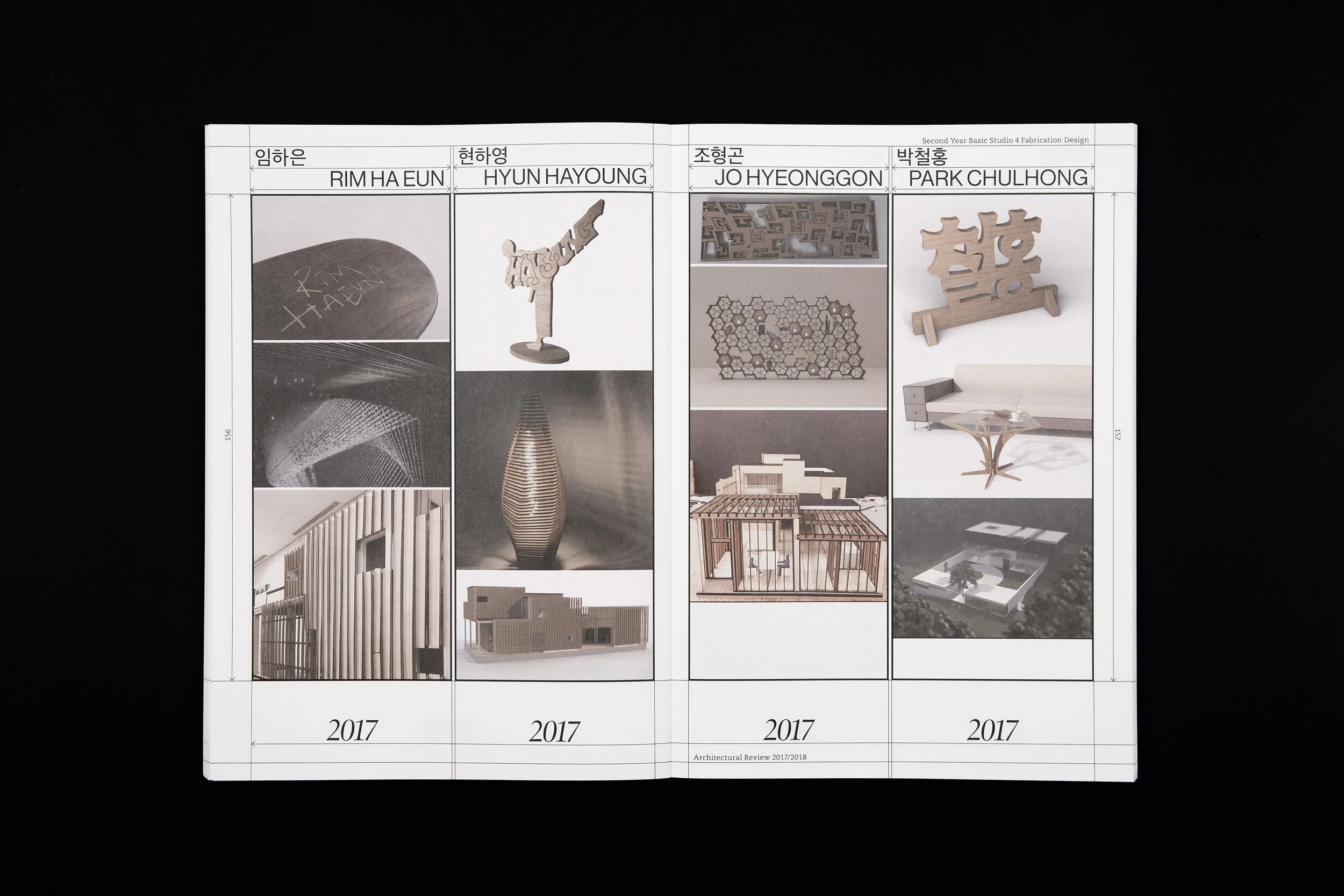 건축 평면 계획도를 그리는 방식에서 모티브를 얻어 <2017/2018 서울대학교 건축학과 연감>을 디자인했다. 수평선과 수직선이 만나 생기는 사각형 공간을 콘텐츠 영역으로 설정하고, 각 컨텐츠 영역에 담긴 정보의 위계에 따라 세 가지 굵기의 선을 부여했다.
